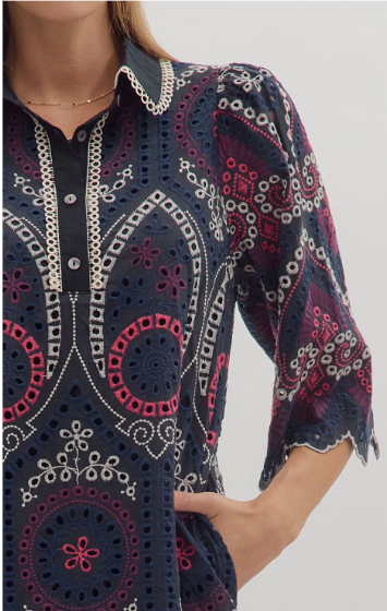 This navy dress with a pop of pink and white is sure to turn heads! It has half sleeves with a button closure front and scalloped hem. It also has pockets. It is lined, non-sheer, and lightweight.