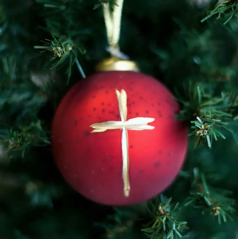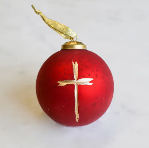 With a beautiful, frosted glass finish, this ornament is sure to look perfect on any Christmas tree! The ornament is red with a gold cross on the center of the ornament. The ornament has a gold piece of ribbon at the top for easy hanging!