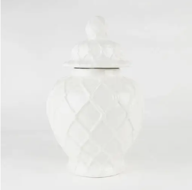 Add a touch of sophistication and timeless style with the White Large Textured Ginger Jar! It is perfect for adding a touch of classic beauty to your interior design. This lovely jar features an intricate textured pattern and removable lid. It is ideal for enhancing any collection of home décor, no matter the theme. Use as a standalone piece, showing off a freshly picked bouquet of flowers or combine with the matching small & extra-large jars for an even more spectacular effect.